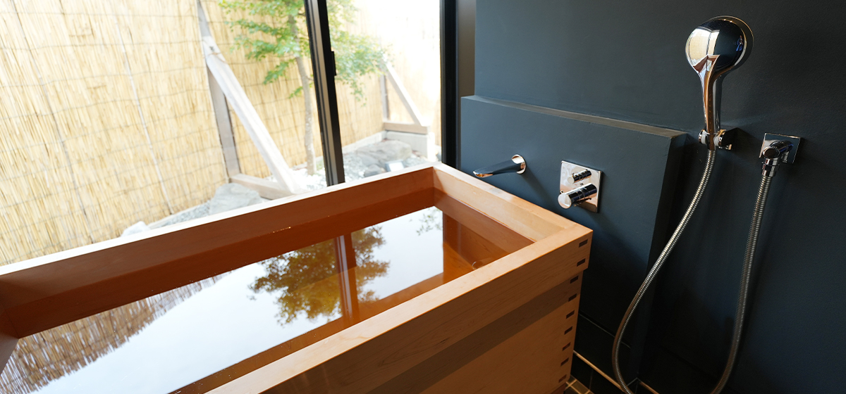 1階離れにある広々とした和モダンな雰囲気の和室で最大5名様までご利用いただけます。浴室にはひのき風呂もあり、ごゆっくりお過ごしいただけます。このお部屋専用の和風庭園がついており、四季折々の景色をお楽しみいただけます。
