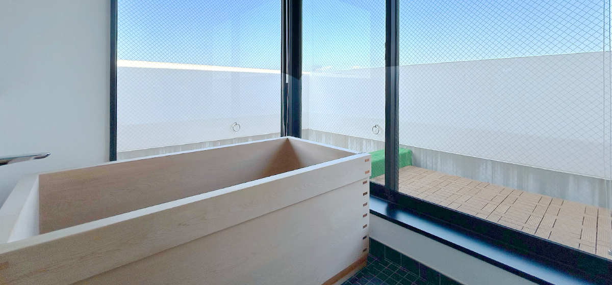 - 浴室設施配備天然檜木浴缸、淋浴設備及獨立專屬陽台